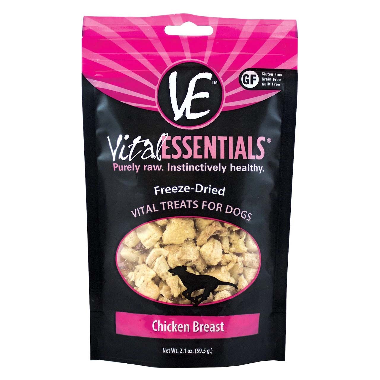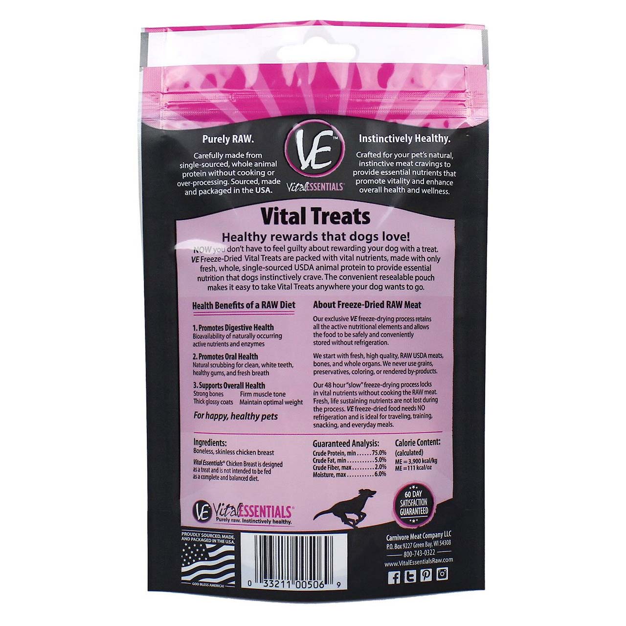 Now you don't have to feel guilty about rewarding your dog with a treat! Vital Essentials Chicken Breast Freeze-Dried Raw Dog Treats are packed with vital nutrients. Made with only fresh, whole, single-sourced chicken, these morsels provide essential nutrition and taste that dogs instinctively crave. A slow, 48 hour freeze-drying process locks in nutrients without cooking the raw meat and allows these treats to be safely and conveniently stored without refrigeration. Your dog will be howling for more!