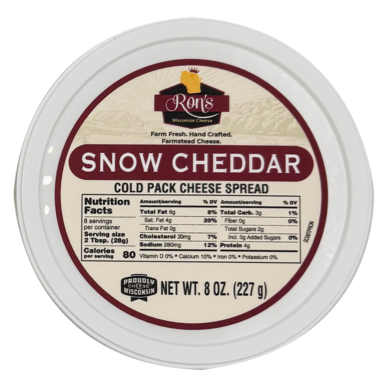 Snow Cheddar Cheese Spread from Ron's Wisconsin Cheese - A cheddar unlike any other, it offers its own distinctive flavor profile of nutty notes that tantalize your taste buds. As it ages, this cheese crystalizes, creating a delightful combination of sweet and savory flavors.