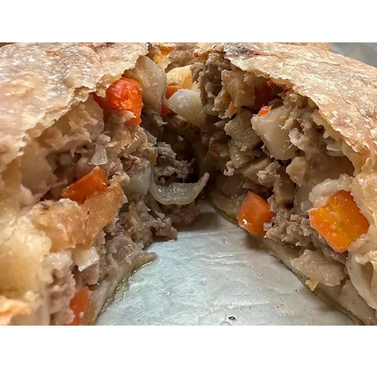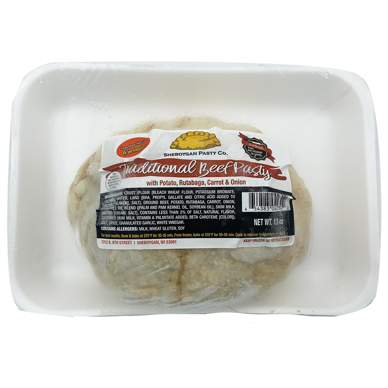 Traditional Pasties from the Sheboygan Pasty Co. in Sheboygan, Wisconsin. Ingredients are: Beef, Potato, Onion, Carrot, & Rutabaga.