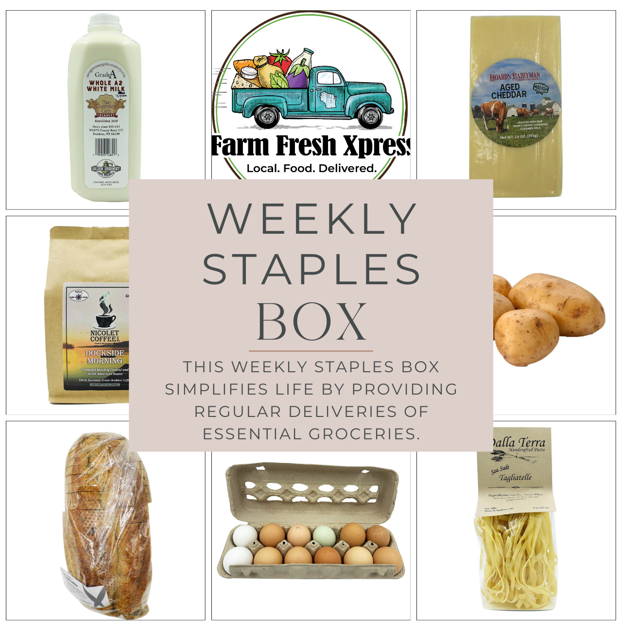 Save 10% when buying this Weekly Staples Box. This weekly staples box simplifies life by providing regular deliveries of essential groceries, saving time and reducing the need for frequent store visits. It's an ideal solution for those seeking a hassle-free way to maintain a stocked and organized kitchen. Items are subject to change due to availability. If an item does need a substitution, it will be replaced with an item as close to the product as possible and of equal cost.